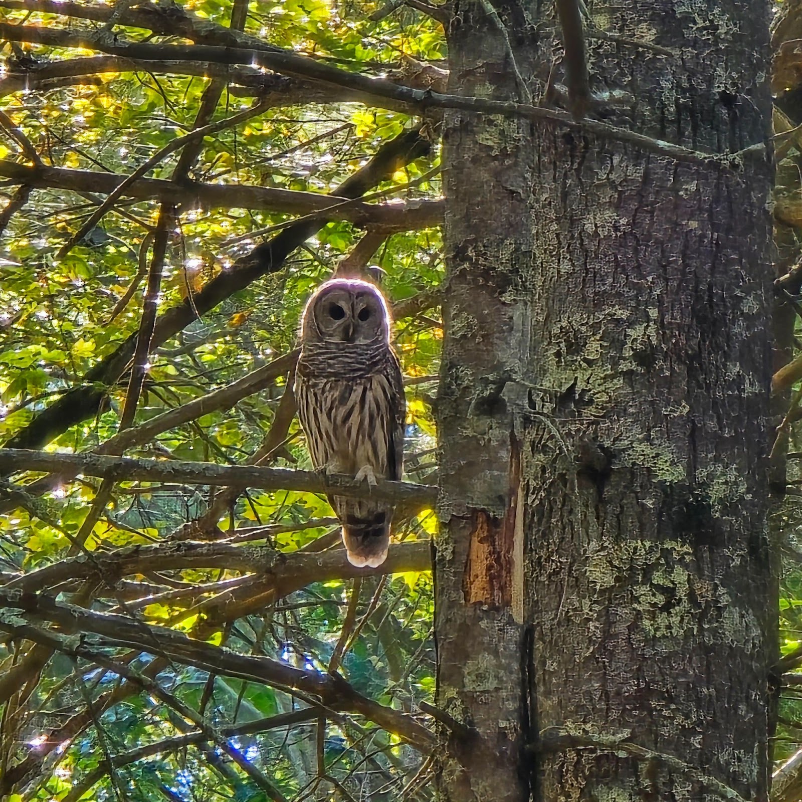 Barreds are easily attracted to imitations of their calls. During the pandemic, my wife remarked to a neighbor that I’d go out hooting “who cooks for you–who cooks for y’all’’ in the back yard after sunset, and insist that the owl answered me. He said, “I do the same thing!” Maybe we were hooting at each other the whole time?