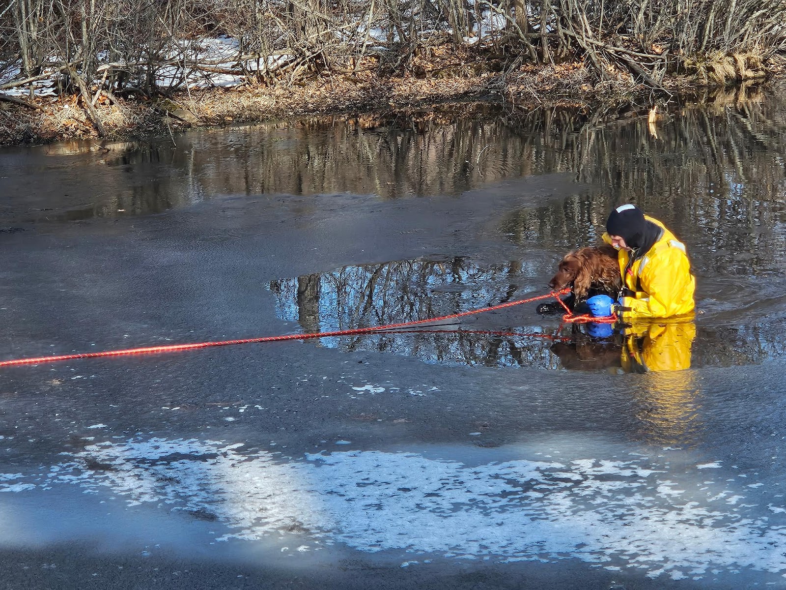 Firefighters were called to Pinebrook Country Club in the early afternoon of Jan. 23 after a report that a dog had fallen through the ice. Firefighter Tim Giblin donned an ice-rescue suit and helped pull Rowan out of the water. She was then reunited with her owner.