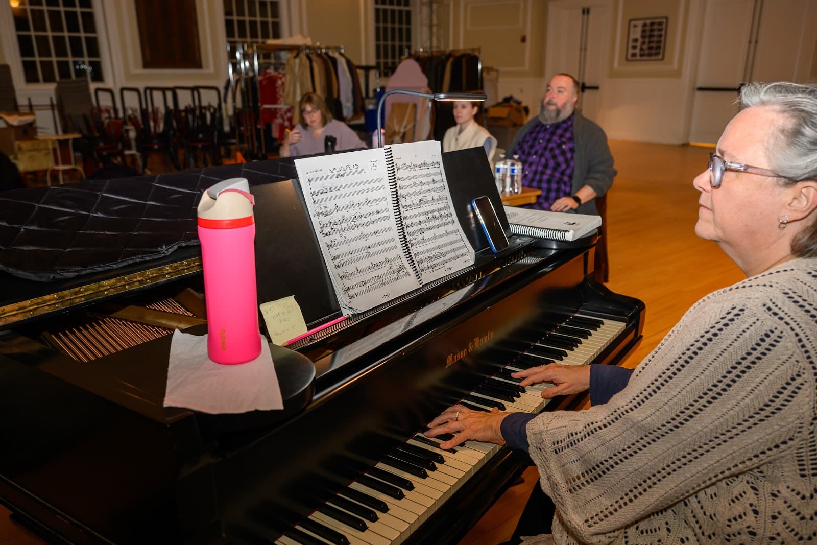 Holly Sullivan sat at the piano working through the show’s score during a recent rehearsal. She is the music director for “She Loves Me” and has been involved with the group for 50 years, first backstage when her parents were in a production. When she went to college, she considered working with the school’s theater department, but other groups were less welcoming than the Friendly. She has continued to work with the Friendly because of the sense of community.