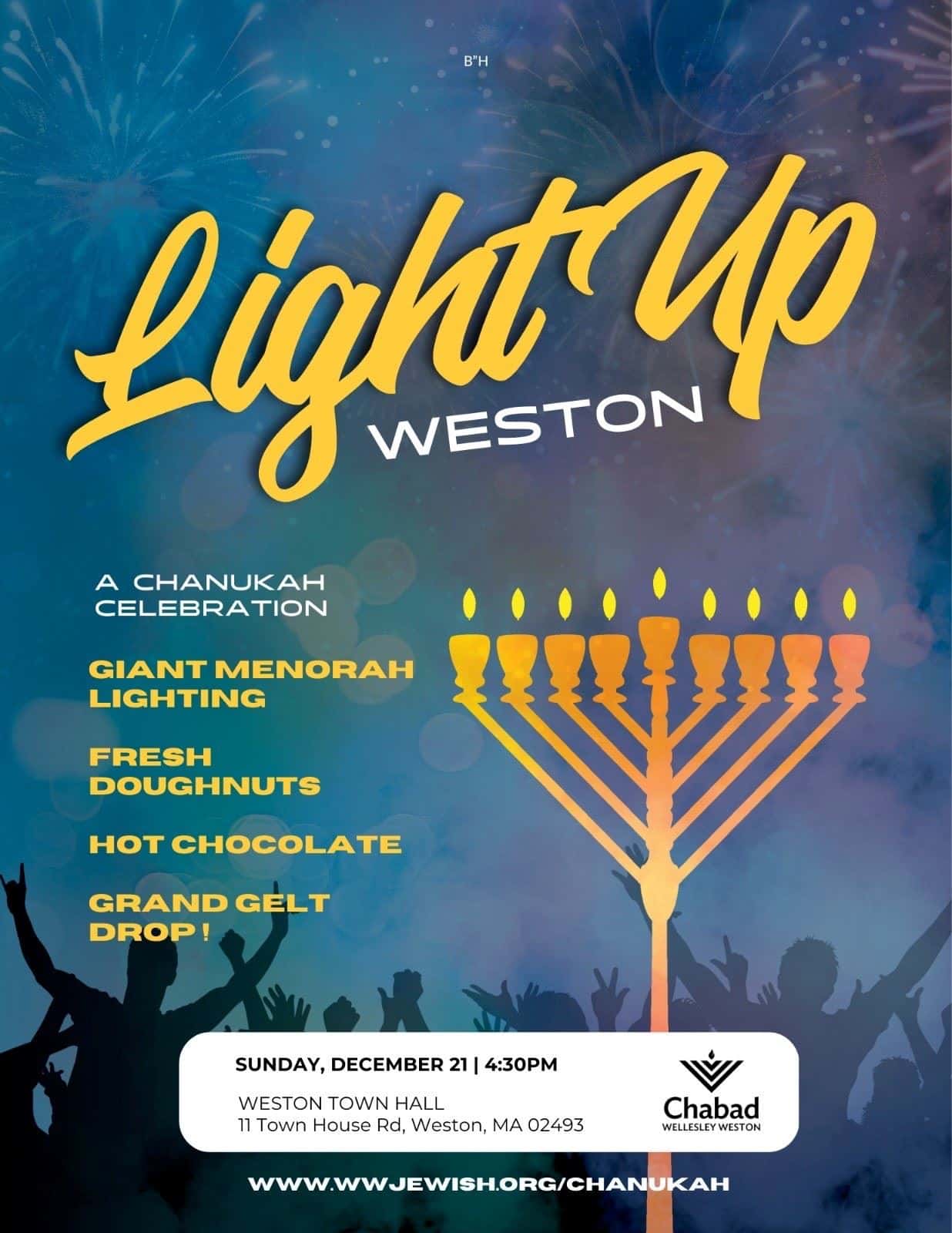 Bleich encourages people to dress warmly and arrive on time so they don’t miss the blessings, the lighting and the gelt drop. Those who cannot attend the Weston event can find details about another menorah lighting in Wellesley, as well as more information about Hanukkah and Chabad, at wwjewish.org.