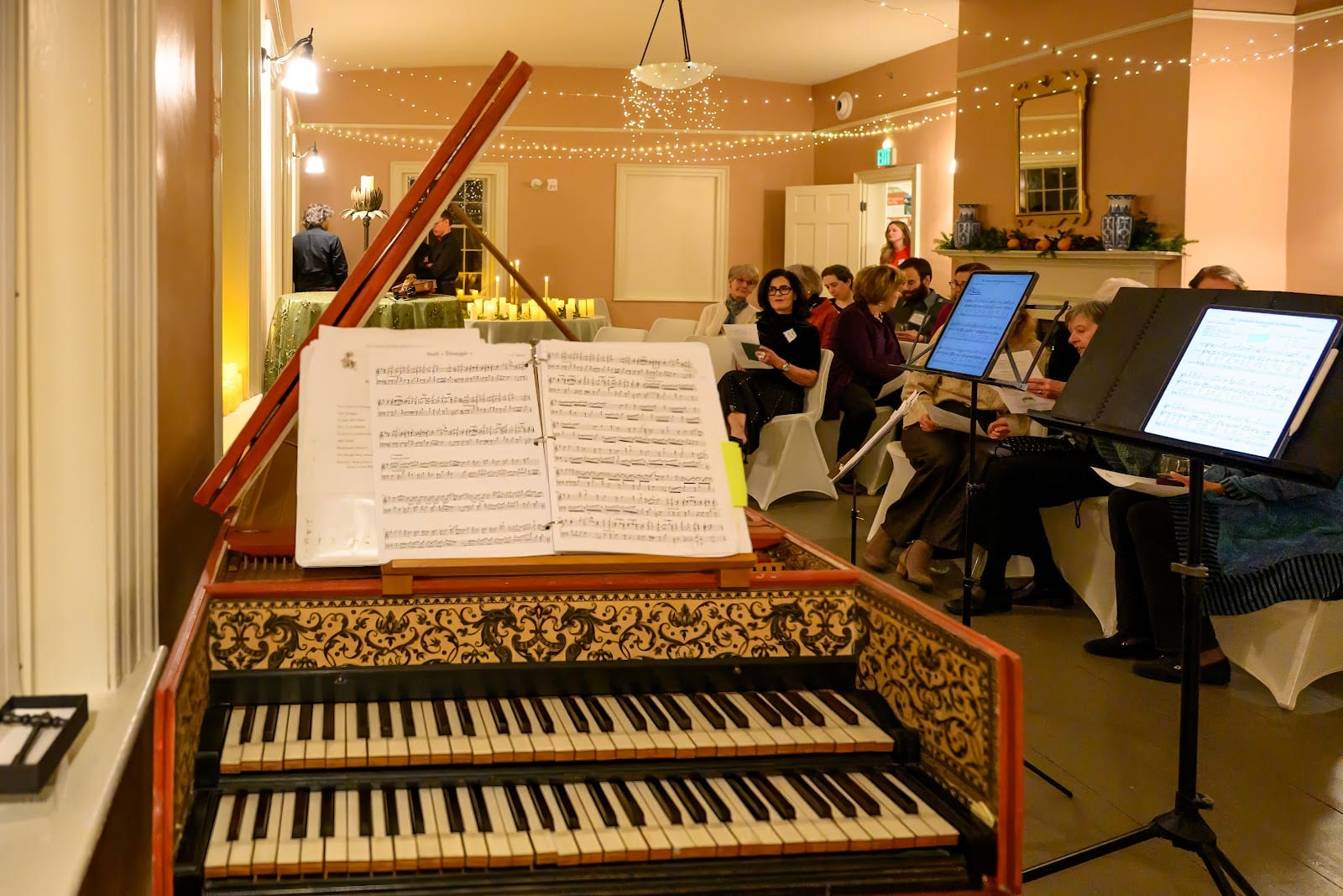 A harpsichord with score at the Musicians of the Old Post Road concert at the Josiah Smith Tavern.