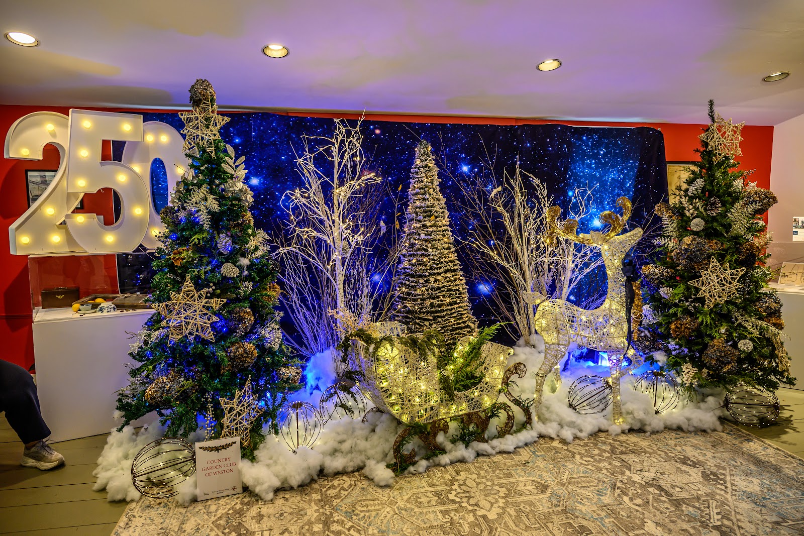 This year’s Trimming the Tavern event at the Golden Ball Tavern was themed “Here’s to the Red, White and Blue!” with rooms decorated by many community nonprofit organizations. This is the Golden Ball Tavern entryway, decorated by the Country Garden Club of Weston.