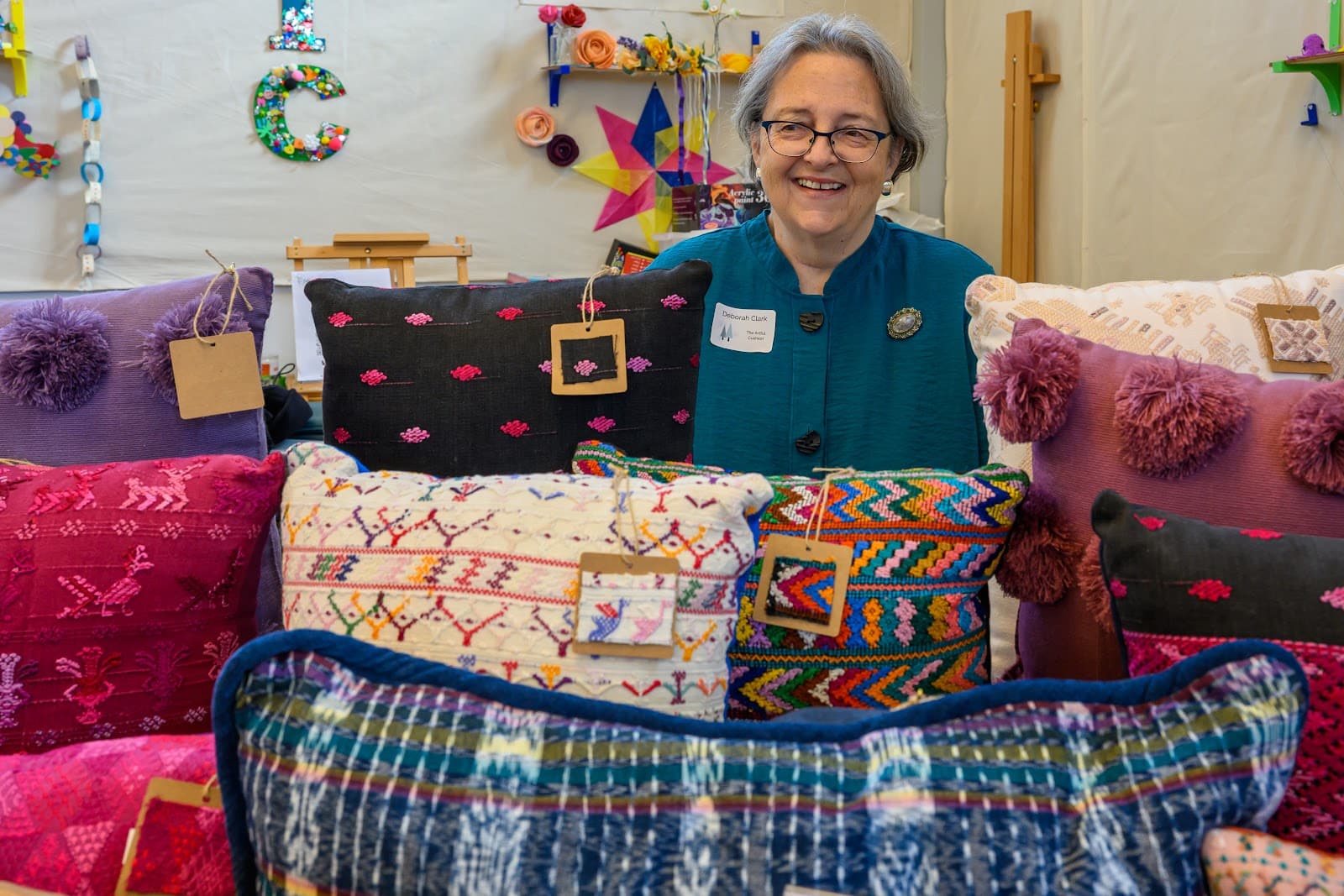 Deborah Clark of the Artful Cushion at the Weston AIC Handmade Holiday Market, showing cushions made from fabric she collected while in the Peace Corps made by indigenous women.