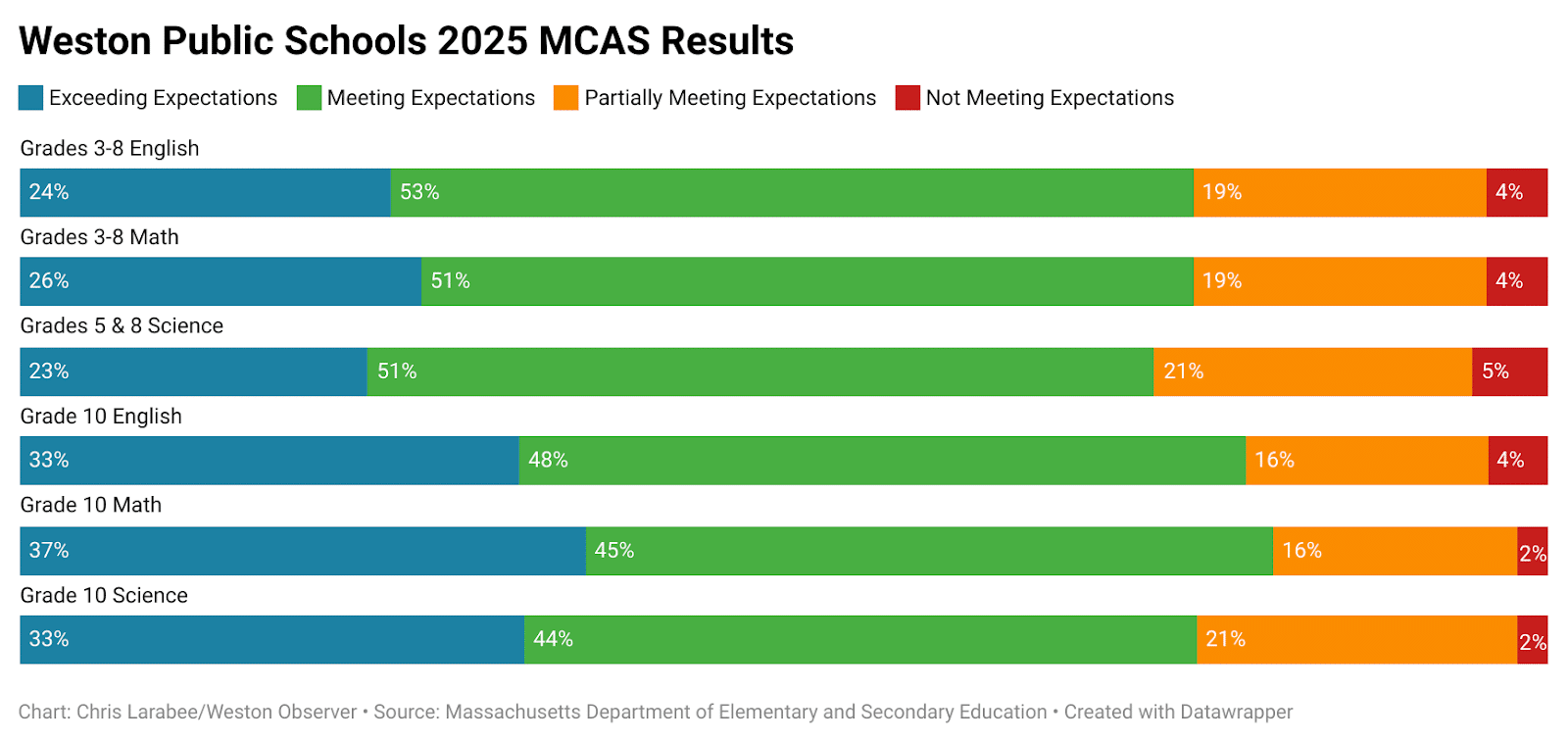 Weston students exceeded state averages on the Massachusetts Comprehensive Assessment System (MCAS) in 2025, according to new results released by the Department of Elementary and Secondary Education (DESE) last week.