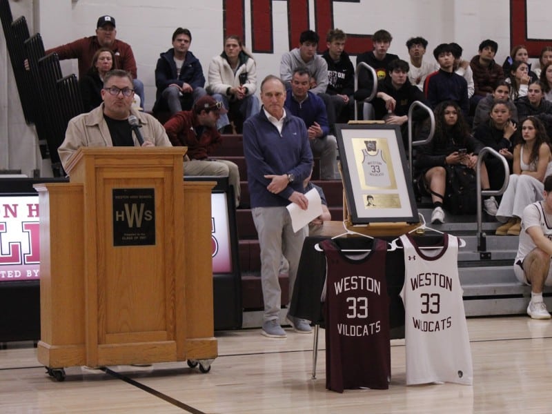 In a halftime ceremony at Weston’s Jan. 6 game versus Wayland High School, the boys basketball team retired Jared Groff’s jersey.