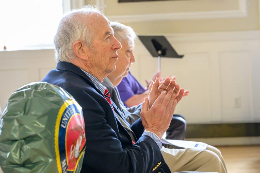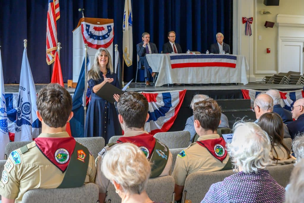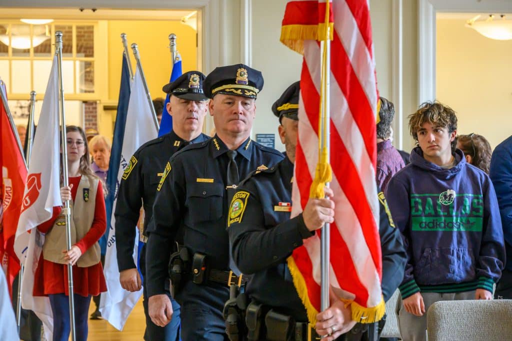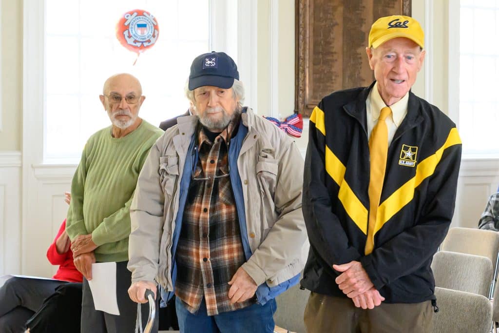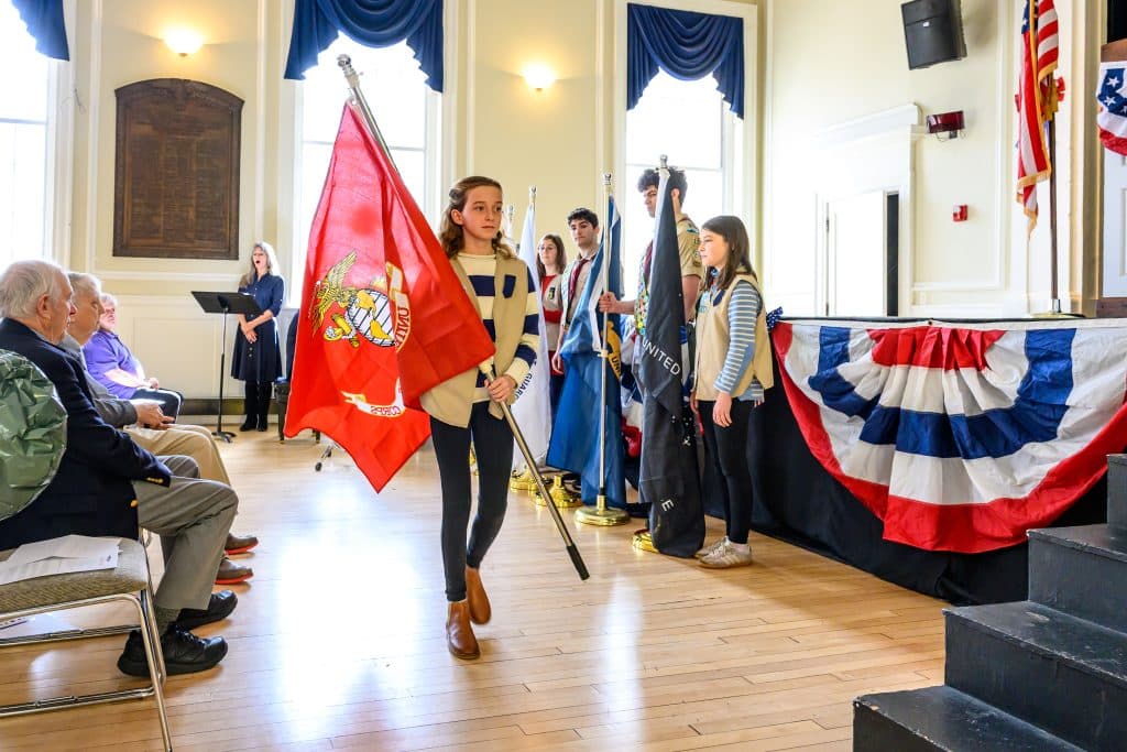 On Tuesday, Nov. 11, Weston held its annual Veterans Day commemoration, honoring those residents who served in uniform to uphold the ideals of the nation. Ceremonies began with the tolling of the Paul Revere bell at First Parish Church, followed by a program at the Sears Auditorium in Town Hall. Veterans Service Officer Dan O’ Neill was master of ceremonies and Rip Hastings, town moderator and veteran of the U.S. Coast Guard, delivered the keynote speech.
